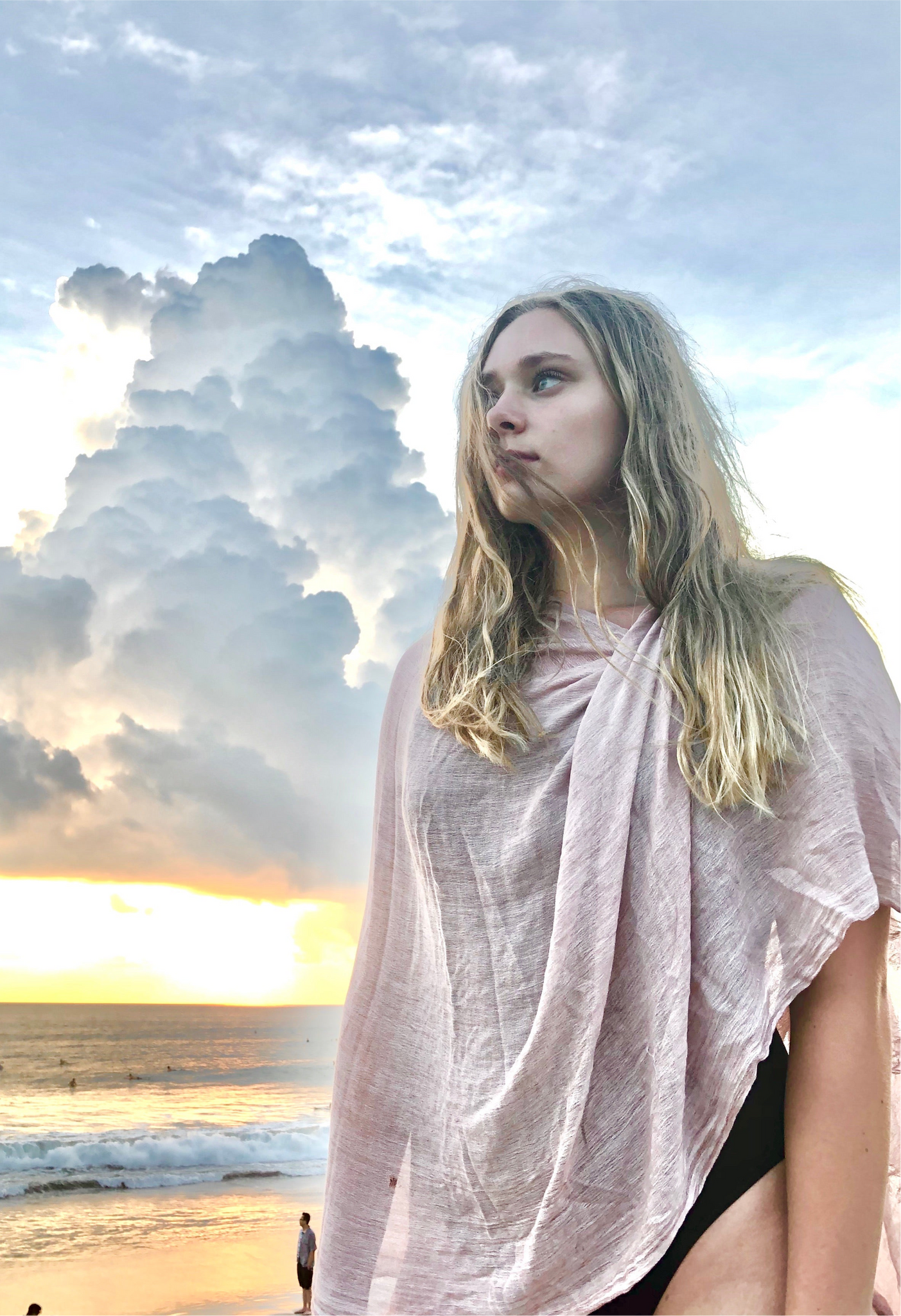 The Every is mostly worn with the length at the back. It will come right down to the ankles at full length when worn over swimwear, but most commonly when lifting the length, it will create the beautiful roush and cowl at the front.  Then by gently lifting it up over your shoulders and clothing, it will begin to drape and create beautiful folds